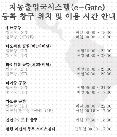 - e-gate 처음 등록하는 사람 : 등록센터 창구 이용시간이 있어서, 새벽 비행기를 이용하신다면 등록을 할 수 없습니다.